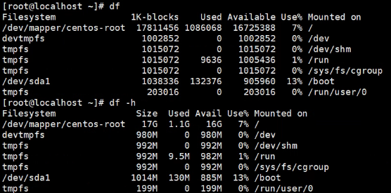 /dev/mapper/centos-root   17G  1.1G   16G   7% /