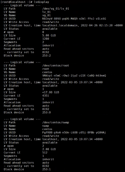 lvdisplay 显示有关逻辑卷的信息(查看 LV 详细信息)