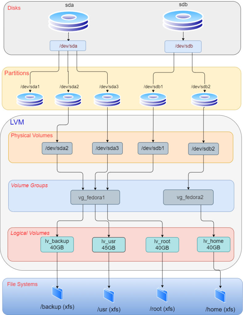 Disk -> Partition -> PV -> VG -> LV -> FS,即:磁盘->分区->物理卷->卷组->逻辑卷->文件系统